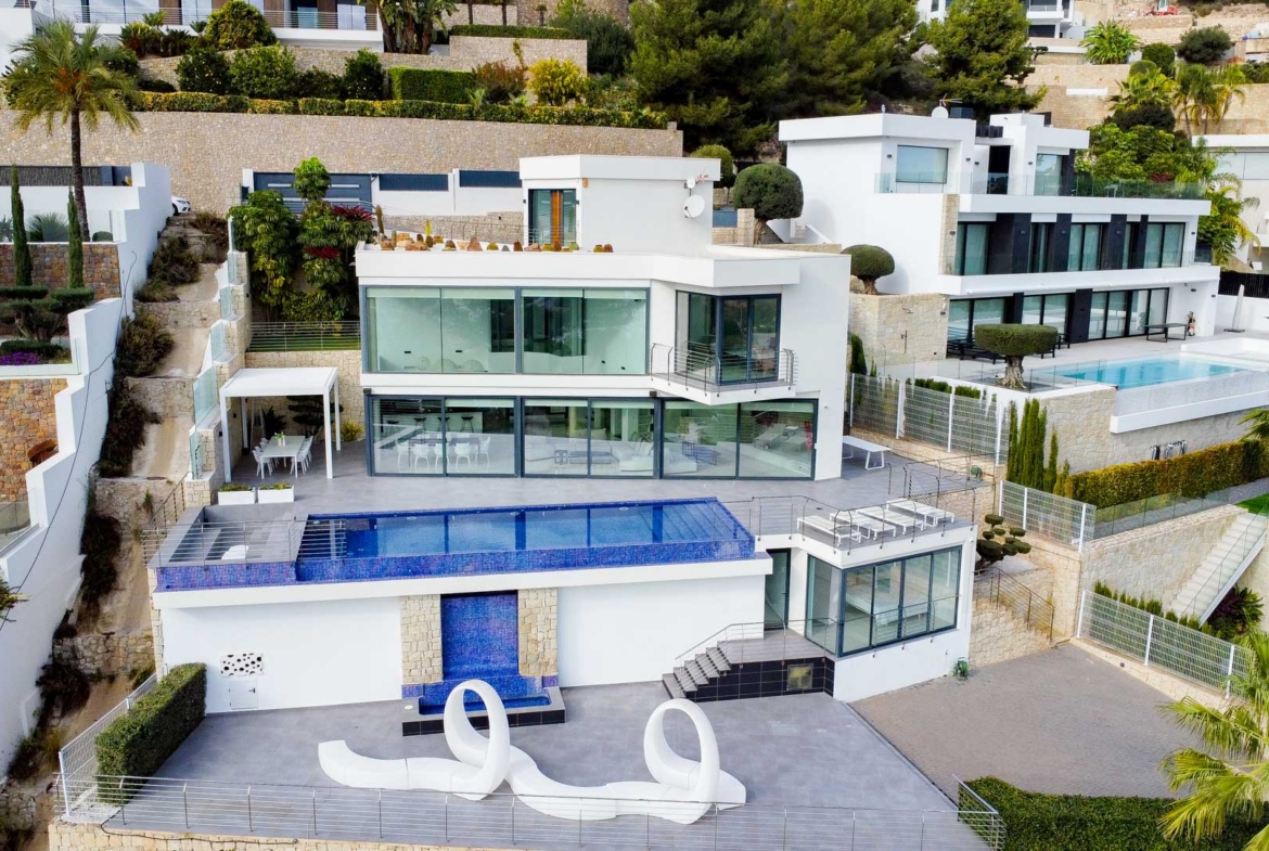 In der prestigeträchtigen Wohngegend Raco de Galeno, nur 1.500 Meter vom Mittelmeer entfernt, steht diese außergewöhnliche Villa, die alles bietet, was Sie sich wünschen können. Mit spektakulärem Meerblick, dem ikonischen Peñón de Ifach und einem unvergleichlichen Design ist dies die Immobilie für diejenigen, die ultimativen Luxus und Komfort suchen. Die Villa erstreckt sich über 3 Etagen, die durch einen Aufzug verbunden sind, auf einem großzügigen Grundstück von 1.800 m². Mit einer bebauten Gesamtfläche von nicht weniger als 770 m² bietet diese Immobilie viel Platz für Entspannung, Unterhaltung und Privatsphäre. Dank des cleveren Grundrisses ist das Anwesen sowohl von oben als auch von unten zugänglich. Oben gibt es einen Parkplatz für drei Fahrzeuge und einen direkten Zugang über einen Aufzug oder eine Treppe zu den unteren Etagen. Im unteren Teil des Grundstücks finden Sie weitere Parkplätze auf verschiedenen Ebenen, so dass Sie auch auf der Ebene des Erdgeschosses parken können. Außerdem gibt es einen Parkplatz für zwei Autos unter einem Vordach. Das Erdgeschoss ist das Herzstück der Villa. Hier finden Sie ein großzügiges Wohnzimmer mit Essbereich und eine moderne, voll ausgestattete offene Küche mit Bar und gekühltem Weinkeller. Die doppelte Decke und die hohen Fenster schaffen ein beeindruckendes Gefühl von Licht und Raum. Für zusätzlichen Komfort stehen eine Waschküche und ein Gäste-WC zur Verfügung. Auf der Ostseite befindet sich eine große Sommerküche, perfekt für das Kochen im Freien und gemütliche Abendessen. Vor dem Wohnzimmer erstreckt sich ein großzügiger Außenbereich mit einem luxuriösen Pool und einer bioklimatischen Pergola, unter der Sie mit bis zu 12 Personen speisen können. Ein eingebauter Sitzbereich neben dem Pool bietet Schutz vor dem Wind und einen unschlagbaren Meerblick. Im Obergeschoss befinden sich drei geräumige Schlafzimmer, jedes mit eigenem Bad en suite. Eines der Zimmer hat eine eigene Terrasse und von allen Zimmern aus genießen Sie einen atemberaubenden Panoramablick auf das Meer. Das Untergeschoss ist ganz dem Wellness und der Entspannung gewidmet. Hier finden Sie einen luxuriösen Fitnessraum, einen großen Innenpool mit Liegebereich, eine Zedernsauna und ein viertes Schlafzimmer mit eigenem Bad und Meerblick. Dieses Schlafzimmer ist sowohl vom Haus als auch vom Garten aus zugänglich, so dass es sich ideal als Gästeunterkunft eignet. Im unteren Teil des Grundstücks befindet sich ein charmantes Gästehaus von 20 m², das für das Personal oder als zusätzliches Gästezimmer genutzt werden kann. Vor dem Cottage befindet sich ein Boccia-Platz, der auf Wunsch in einen Paddle-Platz umgewandelt werden kann. Dank der Süd-Ost-Ausrichtung können Sie auf den verschiedenen Terrassen rund um die Villa den ganzen Tag die Sonne genießen. Raco de Galeno ist eine exklusive Urbanisation, die in den Hügeln von Benissa Costa liegt. In nur wenigen Minuten sind Sie an der wunderschönen Küste von Benissa, die für ihre idyllischen Strände und ihr kristallklares Wasser bekannt ist. Das belebte Zentrum von Calpe mit seinen ausgedehnten Sandstränden und vielen Annehmlichkeiten erreichen Sie in 10 Minuten. Diese Villa in Raco de Galeno ist eine einzigartige Gelegenheit, luxuriös und stilvoll zu wohnen und dabei moderne Architektur, Komfort und eine unschlagbare Lage zu kombinieren.