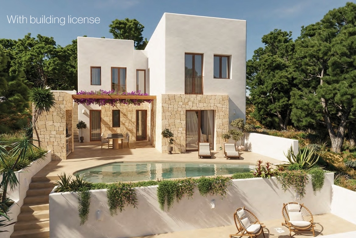 Villa im Ibiza-Stil mit Baugenehmigung, 950 m vom Strand entfernt, in Benissa zu verkaufen