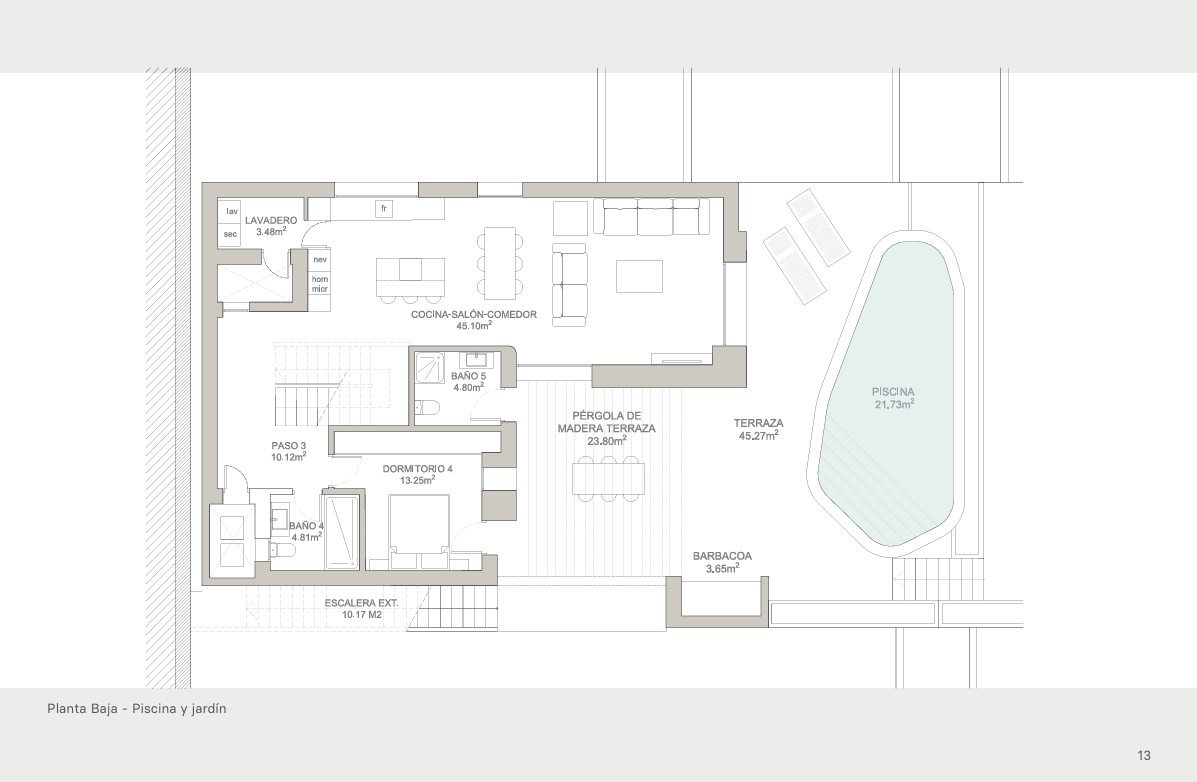 Sie betreten das Obergeschoss durch eine geräumige Eingangshalle. Auf dieser Etage befinden sich drei geräumige Doppelschlafzimmer, jedes mit einem eigenen Bad. Im Erdgeschoss befindet sich der Wohnbereich, bestehend aus einem geräumigen Wohn-Esszimmer mit einer offenen Küche mit Kochinsel und einer Waschküche. Für zusätzlichen Komfort gibt es auf dieser Etage ein viertes Schlafzimmer mit eigenem Bad. Sowohl vom Wohnzimmer als auch vom Schlafzimmer aus haben Sie direkten Zugang zur Terrasse am Pool, die auch über einen Grillbereich verfügt. Darüber hinaus verfügt die Villa über ein voll ausgestattetes Außenbadezimmer, einen Abstellraum und einen Parkplatz für zwei Autos. Für optimalen Komfort sind sowohl eine Klimaanlage (warm/kalt) als auch eine Fußbodenheizung installiert, die über das AIRZONE-System gesteuert werden können.