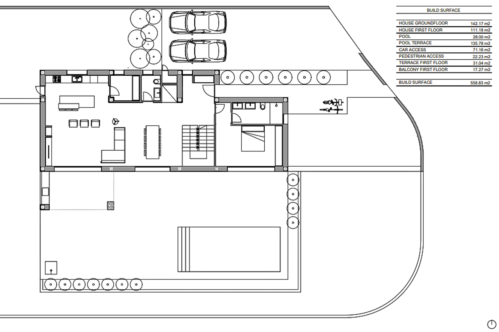 Das Herzstück des Hauses bildet ein heller Wohnbereich mit hohen Decken, der ein geräumiges Wohnzimmer und eine Designerküche mit zentraler Kochinsel und hochwertigen Geräten umfasst. Von hier aus öffnen sich große Fenster zur Hauptterrasse und ermöglichen den Genuss der Aussicht nach draußen.