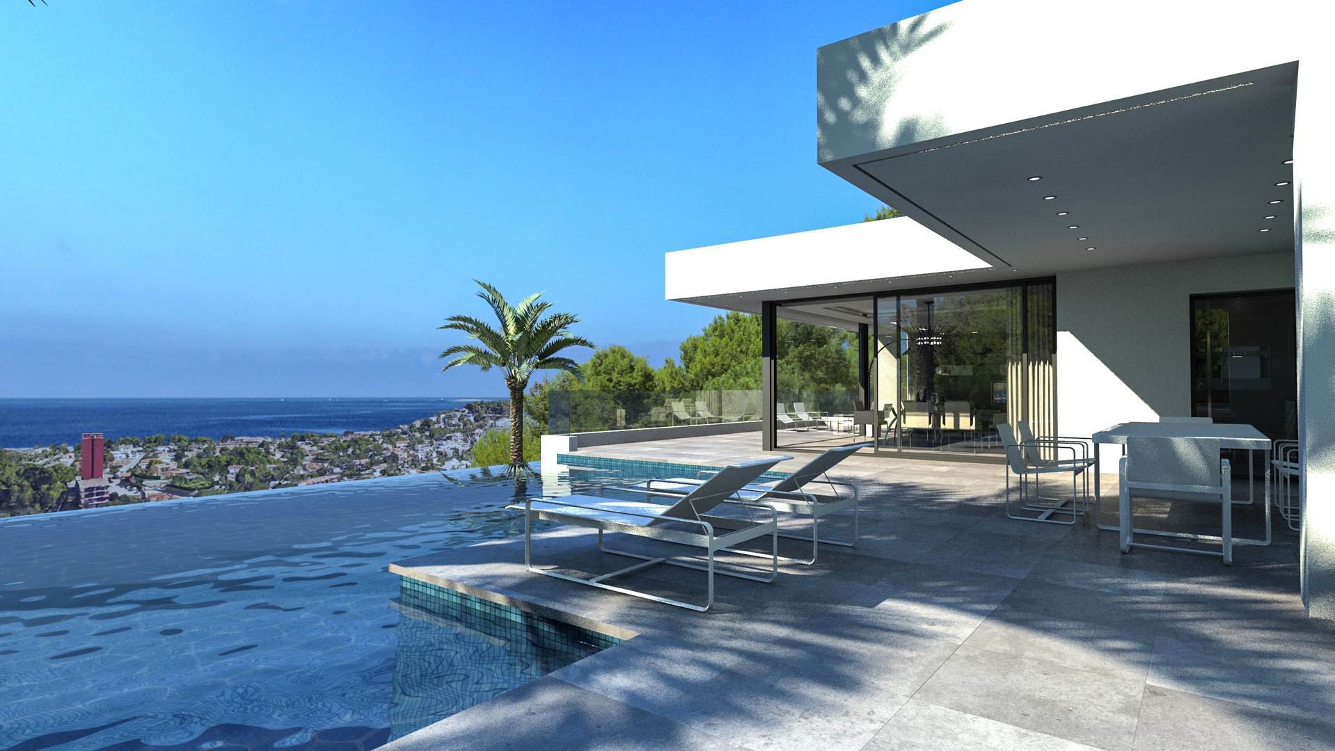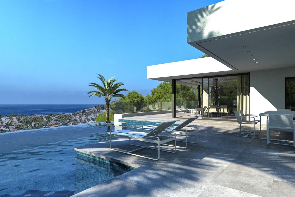 Villa moderna de nueva construcción con vistas al mar en venta en Denia, ubicada al final de una calle sin salida. En la planta baja hay un gran salle de estar con una cocina abierta totalmente equipada. Desde el salón se puede pasar a través de los grandes ventanales a la terraza cubierta y a la piscina. También hay un dormitorio doble con baño en suite y un aseo de invitados. En un nivel inferior hay 2 dormitorios dobles más con baño en suite. En el exterior hay un jardín mediterráneo con piscina desbordante.