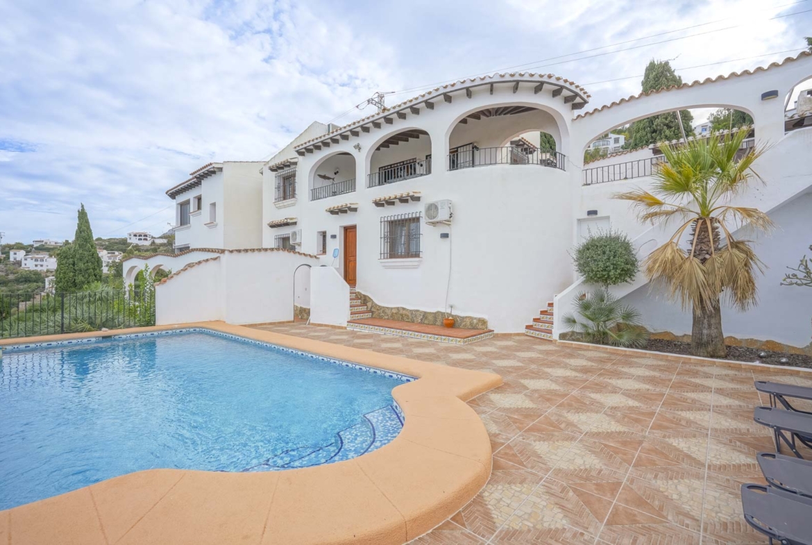 Esta gran villa tradicional española se encuentra en Monte Pego y ofrece impresionantes vistas de 180º sin obstáculos. Las vistas se extienden desde a Pego a través de la reserva natural «Marjal de Pego» y campos de arroz a las montañas al oeste y hasta la costa, con las ciudades costeras de Oliva al noroeste y Denia al este. La villa consta de dos plantas y tiene una casa de invitados independiente conectada a la casa principal. A través de un camino de entrada muy amplio de hasta 280 m2, rodeado de plantas y árboles, se llega a la villa y al garaje. Tanto la villa como el garaje están un escalón más elevados y el camino de entrada tiene cuatro desagües, por lo que nunca tendrá agua en su casa en caso de fuertes lluvias. Gracias al camino de entrada elevado, tiene el lujo de aparcar su coche justo delante de la puerta y entrar en su casa con un solo escalón. Una excepción en Monte Pego, donde a la mayoría de las casas sólo se puede acceder por escaleras. Usted entra en la propiedad en el primer piso donde se encuentra la casa principal. Esta consta de un salón con chimenea, un comedor con una mesa para 8 personas y una gran cocina americana renovada con nevera, lavavajillas, cocina y horno nuevos. También hay dos dormitorios dobles, un baño renovado y un aseo de invitados renovado. En el exterior hay una gran terraza cubierta de unos 20 m2 y un patio con barbacoa y cocina exterior con agua caliente y fría. También se ha instalado un toldo para dar sombra. Una escalera exterior conduce a la zona de la piscina, que es completamente privada y no tiene vistas a ninguna casa. La piscina de 4 x 8 m está rodeada por una gran terraza con espacio para varias tumbonas y una ducha exterior con agua caliente. También se puede disfrutar de unas vistas únicas desde la piscina. En esta planta hay otros dos dormitorios dobles, un cuarto de baño y una habitación extra. (A esta planta sólo se puede acceder desde el exterior). También hay un trastero de 18 m2 para el equipamiento de la piscina y el jardín. Adyacente está la terraza de la casa de invitados con una segunda ducha exterior también caliente/fría. La casa de invitados está conectada a la casa principal por un pasillo y consta de cocina y salón en la primera planta y un dormitorio doble, un baño muy espacioso diseñado por Luigi Colani y un aseo de invitados en la planta baja. El cuarto de baño dispone de calefacción eléctrica por suelo radiante. Existe la posibilidad de convertir el garaje de casi 30 m2 de la primera planta en una sala de estar, ampliando así la casa de invitados. La casa de invitados tiene una entrada privada además de la entrada por la casa principal. Todos los dormitorios y el salón tienen calefacción. Además, en los últimos años se han llevado a cabo varias reformas en la villa. Por ejemplo, toda la villa tiene doble acristalamiento y todas las ventanas y puertas se han renovado con marcos de ventanas de plástico con diseño de madera, se han instalado mosquiteras en todos los dormitorios y se ha colocado suelo nuevo tanto arriba como abajo, se ha instalado aire acondicionado en todos los dormitorios, salón y cocina y se ha renovado la instalación eléctrica. En el exterior, se han colocado casi 220 m2 de baldosas nuevas, incluyendo la terraza cubierta, el patio y la terraza de la piscina. La renovación ha mantenido el estilo castellano, que hace que la villa sea única. La villa está rodeada por un jardín de fácil mantenimiento con riego automático y tiene otra pequeña terraza orientada al sur. Debajo de la villa hay un sótano iluminado que da acceso a todas las tuberías que pasan por debajo de la casa. Todas las puertas y ventanas tienen rejas. Incluido en el precio están todos los muebles, incluyendo ropa de cama, vajilla, etc. Las dos parcelas parcialmente visibles a los pies de la casa están designadas «zona verde», lo que significa que no se permite construir en ellas. Un chalet de mucha calidad a buen precio con unas vistas impresionantes. ¡No lo dude más y solicite su visita! Planos del chalet a petición.