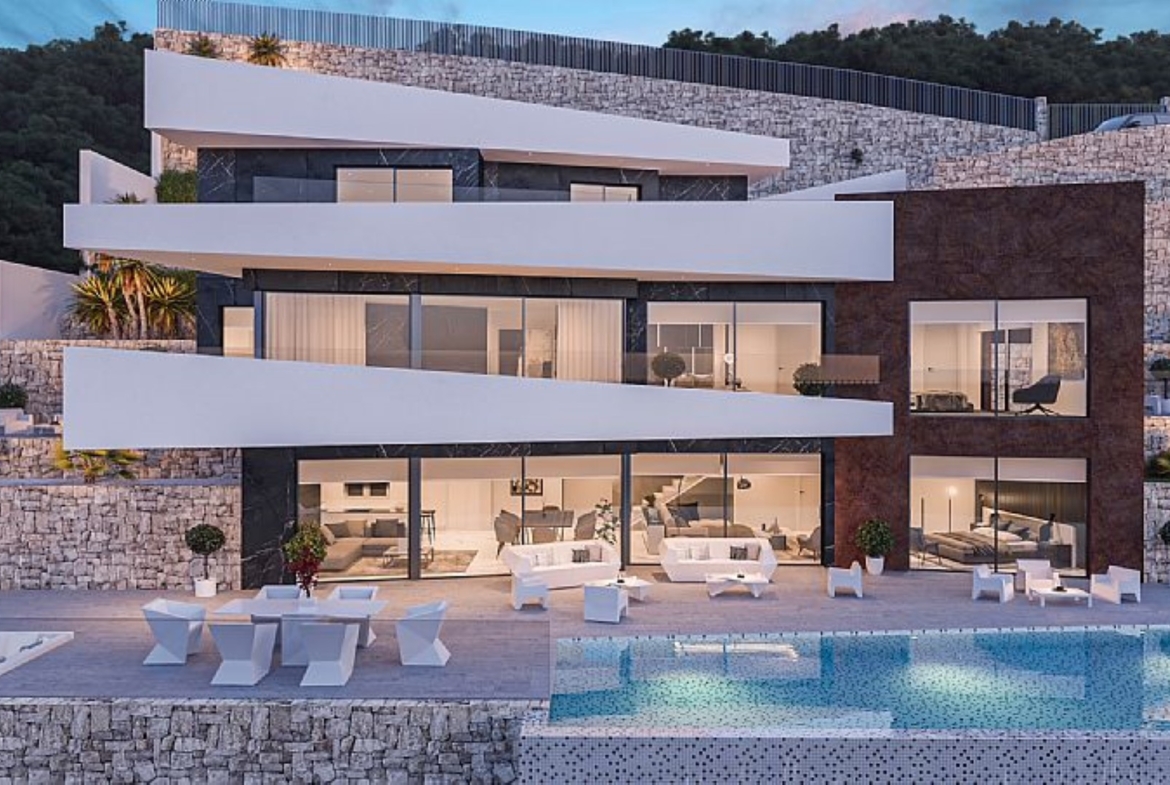Moderne nieuwbouwluxevilla met zeezicht te koop in Benissa gelegen in de villawijk Raco de galeno. De woning telt 4 verdiepingen die verbonden zijn met een lift en een trap. Helemaal bovenaan is er de entree met een garage voor 2 wagens, een terras en verder kan men van hieruit de lift nemen naar de gewenste verdieping. Op het gelijkvloers is er een grote ruimte met een volledig uitgeruste keuken en bijkeuken, een lounge, een eetkamer en een salon. Vanuit deze ruimte kan men naar buiten waar er een groot terras is waarvan er en deel overdekt is, verder is er een chill-out zone en een overloopzwembad. Nog op het gelijkvloers is er tweepersoonsslaapkamer met en suite badkamer. Op de eerste verdieping is er de master bedroom met een dressing, een en suite badkamer en een terras. De master bedroom is maar liefst 50m2 groot. Verder zijn er nog 2 tweepersoonsslaapkamers met en suite badkamer waarvan 1 nog een prive terras heeft. In de kelder is er een SPA met een binnenzwembad en een sauna, een gym, een home cinema, een multi functionele ruimte, een bijkeuken en een toilet. Buiten is er een mediterane tuin met veel natuurstenen muren. Meer informatie op aanvraag.