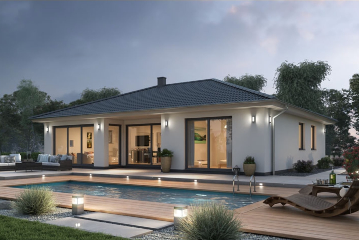 New build villa for sale in Javea, the price includes the plot, garden, pool and house. This property can be delivered within 18 months. In the house there is a living room with an open kitchen and utility room and 2 double bedrooms with en-suite bathroom. Outside there is a low maintenance garden with pool and terrace.