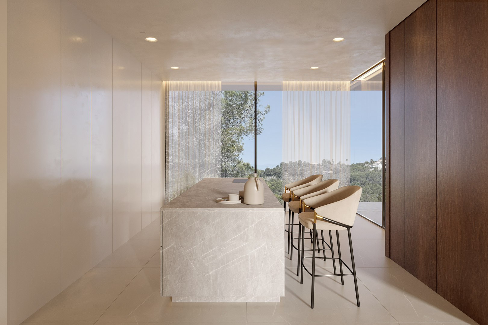 The interior has been designed with the same attention to detail as the exterior, incorporating fine materials and warm textures that provide elegance, exclusivity, and comfort. The villa also includes a kitchen equipped with the latest technologies and top-quality finishes, as well as solar panels, reinforcing its modern and sustainable character.